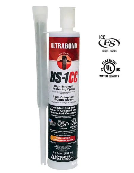 ULTRABOND® HS-1CC is the world’s first anchoring epoxy formulated to be IBC/IRC compliant in both bulk and cartridge delivery systems. For use in dry, damp, water-filled and submerged applications, even in the most extreme temperatures and loading conditions, new ULTRABOND HS-1CC outperforms every other anchoring and doweling epoxy in the world. Shop this with ATC today!