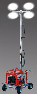The GB43LED GloBug 4-Spot LED Light Tower is the ultimate portable lighting source when compact and efficient lighting is required. The small footprint allows transportation of several units in small delivery vehicles. No tools are required to adjust the lamps for quick deployment. The GB43LED produces 152,000 lumens of clear, crisp LED lighting. (shown with optional portable generator)