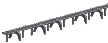 The Tuff Slab Bolster is fabricated from fiber filled gray material designed to blend with the concrete surface, if exposed. Top bar corrugations are placed on 1” centers to visually aid rebar placement. The Tuff Slab Bolster is manufactured in true 60” lengths, eliminating assembly and expedites field placement.