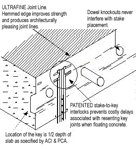 - Positive stake-to-key lock of PRO-KEY™ [Patent No. 5380122] prevents costly delays associated with resetting key joint when floating concrete. Stakes interlock with slots to prevent the key from rising off the stakes.