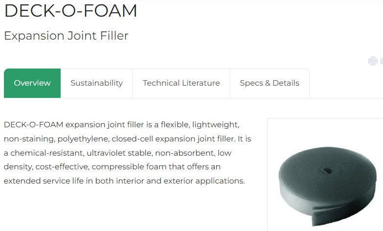 DECK-O-FOAM expansion joint filler is a flexible, lightweight, non-staining, polyethylene, closed-cell expansion joint filler. It is a chemical-resistant, ultraviolet stable, non-absorbent, low density, cost-effective, compressible foam.
